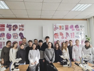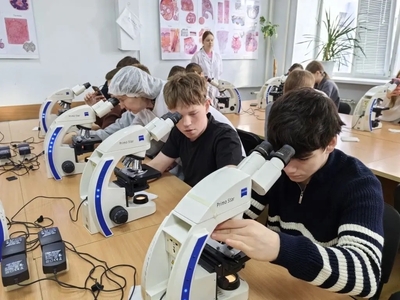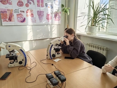- Практическая работа с микропрепаратами под руководством студентов 2 курса Макара Бычко и Арины Никитиной.
